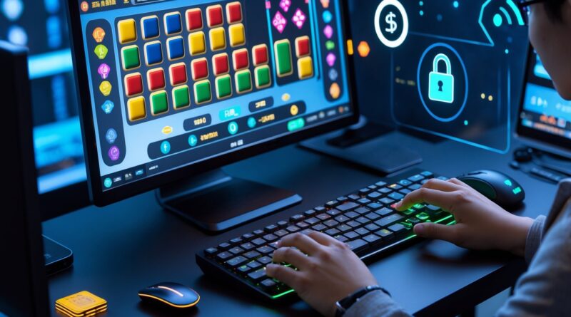 Seorang pemain muda sedang menggunakan antarmuka digital dengan tampilan permainan slot dan mahjong di layar transparan, menunjukkan suasana permainan daring yang modern dan cepat.